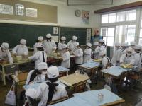 今日から、かわいい1年生の給食が始まりました。今日のお手伝いは、テストで忙しい6年生に変わって、5年生のお兄さん、お姉さんが手伝いに来てくれました。今日は市の栄養教諭の鶴井先生や井上先生も来てくれました。