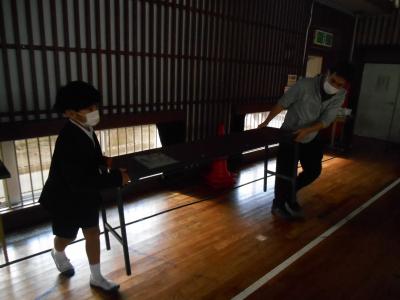 会場準備は、6年生の子どもたちが中心となって行ってくれました。体育館の楽器を少し片づけてから、60名の保護者の方の椅子を並べたり、机を運んだり、配布物を配って確認したりと、細かなところまで気を配りながら作業を進めていました。受付でも頼りになるお兄さん・お姉さんとして優しく対応していますさすがです