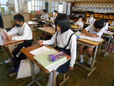 4年生はボールを使ったゲームに取り組んでいました。体育の授業ではまだまだ半袖で頑張っている子も風邪をひかないように気を付けてね5年生はタブレット端末を活用した授業、6年生は家庭科のトートバックにつけるネームタグ制作に挑戦していました。